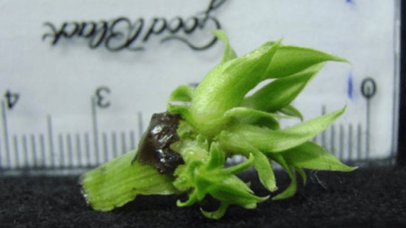 Organogênese: formação de plantas de abacaxizeiro a partir da base de uma folha (explante) da planta-mãe cultivada in vitro. (Foto: Thais R. Semprebom)